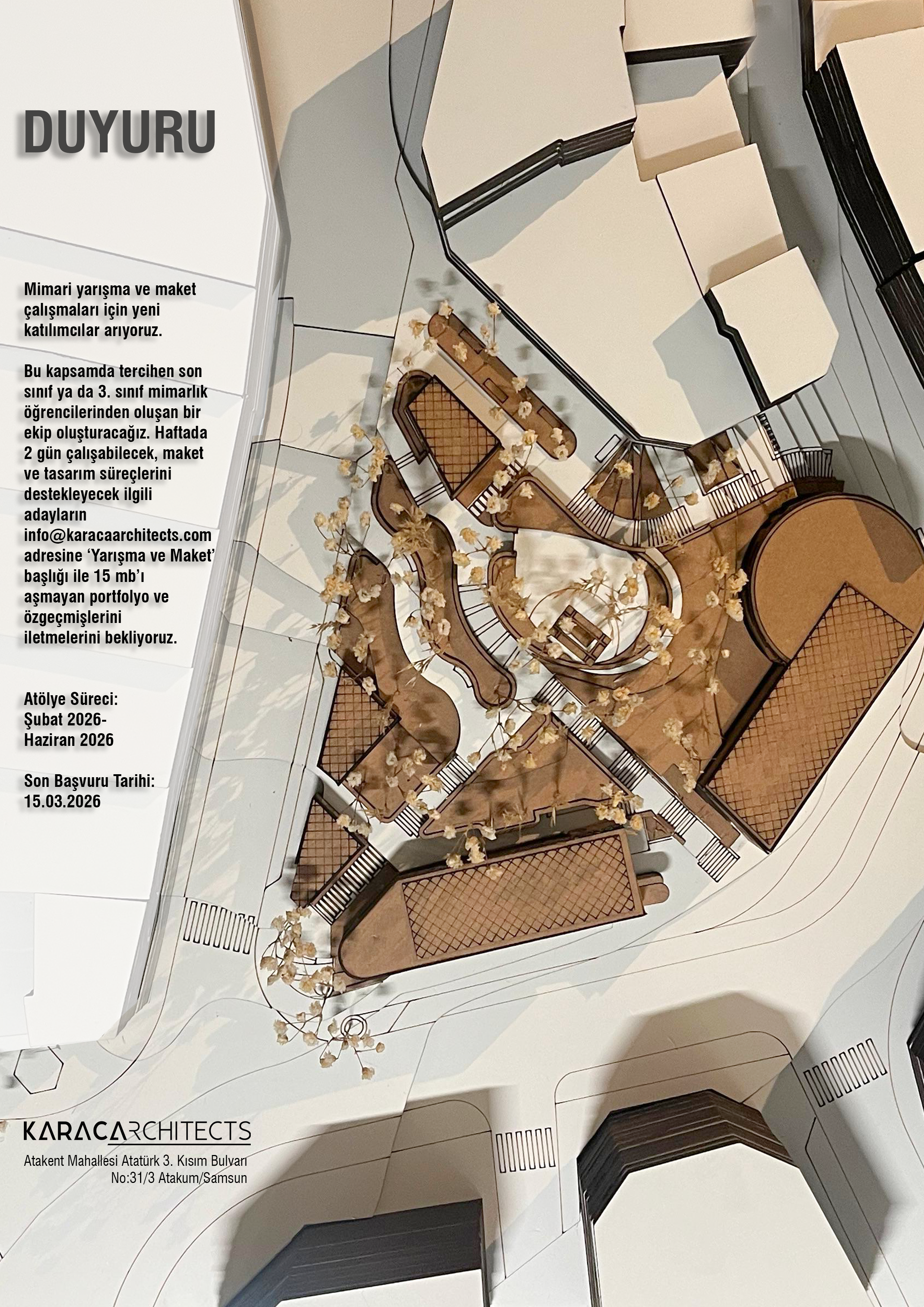 Karaca Architects / Mimarlık olarak Ulusal mimarlık yarışmalarına ve maket çalışmalarına destek olabilecek, mimarlık bölümü öğrencilerinden katılımcılar aranmaktadır.Duyuruya ilişkin bilgiler afişte yer almaktadır.